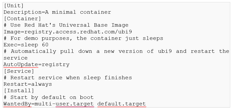 یک روش آسان و مستقیم برای مدیریت بهروزرسانیهای کانتینر بارهای کاری استفاده از بهروزرسانیهای خودکار Podman است. به طور پیشفرض، Podman با سرویس systemd به نام podman-auto-update.service عرضه میشود که مسئول بهروزرسانی Image و راهاندازی مجدد سرویسهای systemd یعنی Quadletها برای استفاده از Image بهروزرسانی شده است. این سرویس یکبار در روز توسط تایمر podman-auto-update.timer فعال میشود که میتوان آن را با نیازهای شما پیکربندی کرد. اگر بهروزرسانی مبتنی بر رویداد را ترجیح میدهید، میتوانید سرویس را شروع کنید یا مستقیماً دستور podman auto-update را اجرا کنید. برای پیکربندی یک Quadlet .container برای بهروزرسانی خودکار، گزینه AutoUpdate=registry را به جدول Container اضافه کنید، میتوانید ار خط دستوری که در زیر آمده است استفاده کنید:
