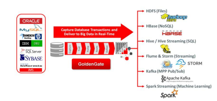 Oracle GoldenGate به Capture نمودن دادهها از سیستمهای منبع ناهمگون از جمله سیستمهای پیامرسان مبتنیبر Java به صورت Non-Invasively و با سربارِ ناچیز میپردازد. این نرمافزار، تراکنشهای پایگاه داده را در Trail Fileها ذخیره نموده و به چارچوبِ Java Adapter میفرستد. Oracle GoldenGate for Big data دارای Adapterهایی برای انواع تکنولوژیهای مربوط به Big Data مانند HDFS، Hive، HBase یا Flume میباشد. ضمن اینکه Oracle GoldenGate for Java را نیز دربرگرفته و این امکان را برای مشتریان فراهم مینماید تا فرآیند تحویل به سایر سیستمهای Big Data را به سهولت انجام داده و از موارد کاربردی خاص و مورد نیاز محیط پشتیبانی نمایند.