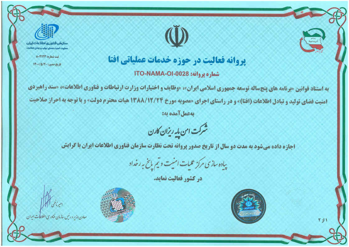 شرکت امن پایه ریزان کارن APK در جهت پیشرفت هر چه بیشتر در زمینه خدمات شبکه و انتقال داده، امنیت اطلاعات و ارتباطات، پس از دوسال فعالیت در حوزه پياده سازی مركز عمليات امنيت و تيم پاسخ به رخداد (SOC/CERT) موفق به تمدید این مجوز گردیده و امید است به مانند گذشته بتوانیم قدم های موثری در جهت افزایش امنیت سازمان ها برداریم.