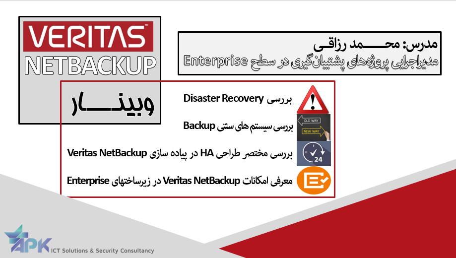 شرکت APK (امن پایه ریزان کارن) در راستاي بسط و گسترش دانش مرتبط با فعالیتهای تخصصي خود، در نظر دارد تا با همکاری یکی از برجستهترین متخصصین کشور در زمینهی پشتیبانگیری و استوریج، وبینار رایگان Veritas NetBackup را با محورهای زیر برگزار نماید. در پایان جلسه با توجه به کاملا آنلاین بودن آن امکان پرسش و پاسخ آنلاین نیز با استاد فراهم گردیده است. از علاقمندان دعوت می شود با توجه به محدود بودن نفرات شرکت کننده در وبینار، حداکثر تا تاریخ 19 آبان 97 از طریق لینک زیر جهت ثبت نام اقدام نمایند: