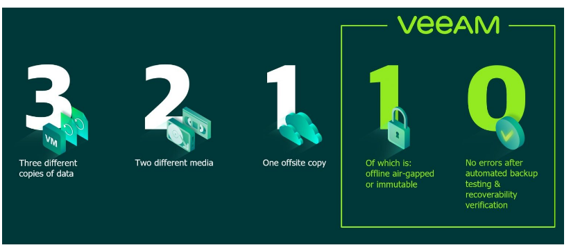 ابتدا، به اصول اولیه میپردازیم. باید یک نسخهی پشتیبان از تمام دادهها، در صورت از دست رفتنِ کامل، نگهداری شود و قانون 3-2-1-1-0 یکی از راههایی است که معتبر و قابل بازیابی بودن آن را تضمین میکند. ممکن است شما با قانون 3-2-1 آشنا باشید. در واقع 1-0 اضافه شده به اطمینان از قابلیت ترمیم خودکار سایبری یا Resiliency کمک میکند. با حملات مکرر باجافزار، اطمینان از داشتن نسخهای از دادههای تغییرناپذیر یا غیرقابل تغییر با خطای صفر بسیار مهم است. میدانیم که مجرمان سایبری پیش از حمله، دادههای پشتیبان را تغییر میدهند تا اطمینان حاصل کنند که شما نمیتوانید آنها را بازیابی کنید، و در نهایت تنها گزینهی پیش رو برای سازمان ها پرداخت باج خواهد بود. پس باید مطمئن شد که یک نسخه از دادههای پاکسازیشده وجود دارد که غیرقابل تغییر است.