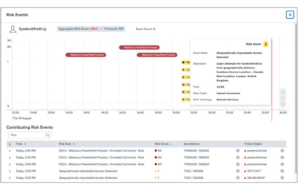 راهکار Splunk ES از هشداردهی برمبنای ریسک یا RBA استفاده میکند تا از طریق ارتباط دادن ریسکها به کاربران و نهادها تهدیدات پیچیده را شناسایی کند و فقط وقتی که از آستانههای رفتاری عبور میشود و تاکتیکهای MITRE ATT&CK رعایت میشوند هشدار را فعال میکند. با ساختن مجموعهی جامعی از تخصیصها با RBA و Splunk UBA و ایجاد مبنایی رفتاری از هر حساب کاربری، شناسایی ناهنجاریها در مقایسه با رفتار مبنایی کاربر ساده میشود. این امر معمولاً نشاندهندهی استفادهی شدید، دسترسی نادر، احتمال خرابکاری یا مخفی کردن ردپا است. وقتی که تفاوت رفتار کاربر با رفتار عادی ادامه پیدا کند، اطمینان UBA افزایش پیدا میکند و احتمال شدید بودن ریسک بالا میرود.