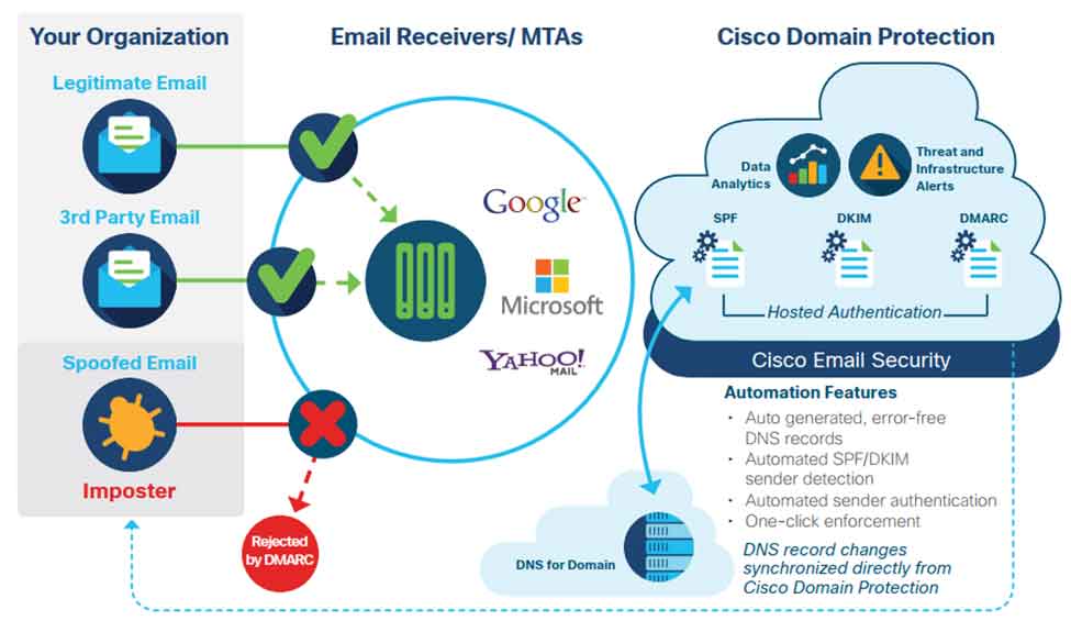 قابلیت Cisco Domain Protection احراز هویت و اعمال DMARC را به منظور محافظت از برند و مشتریان سازمان خودکارسازی میکند. این قابلیت برای پیادهسازی ایمیل On-Premise و پلتفرمهای ایمیل Cloud مانند Office 365 و GSuite 2019 Cisco و زیرمجموعههای آنها امنیت را به ارمغان میآورد و تمامی حقوق حفظ میگردند. ایمیل حیاتیترین راه ارتباط سازمانها برای مشارکت با مشتریان خود و اولین راه نفوذ تهدیدات توسط مجرمین سایبری است تا از طریق حملات Phishing مشتریان سازمان را تحت هدف قرار دهند.
