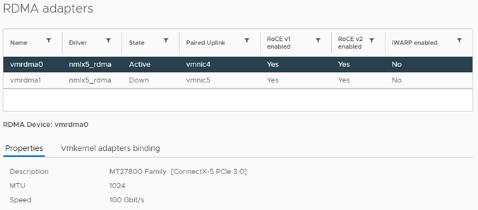 جهت تنظیم PVRDMA برای یک VM، فابریک اترنت باید از RDMA پشتیبانی کند و برای هر Host به یک HCA نیاز است. دستور esxcli زیر را میتوان مورد استفاده قرار داد تا NICهای دارای قابلیت RDMA بررسی گردند، میتوان معادل این دستور را هم در vSphere Client یافت. تمام رابطهای کاربر شبکهی Host در بخش RDMA نمایش داده میشوند و مشخص میگردد که آیا RDMA تحت پشتیبانی است یا خیر.