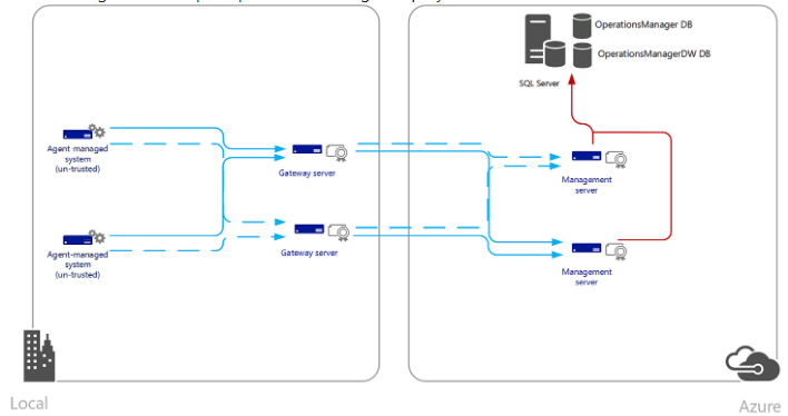 زمانی که فایروال، Agentها را از سرور Management جدا میکند یا وقتی Agentها در دامنهی Un-Trusted جداگانهای هستند، سرورهای Gateway مورد استفاده قرار میگیرند. سرور Gateway مانند یک پروکسی بین Agentها و سرور Management عمل میکند. Agentها حتی میتوانند بدون سرور Gateway، Certificate احراز هویت را با سرور Management انجام دهند، اما یک Certificate X.509 باید روی هر Agentی که از ابزار MOMCertImport.exe استفاده میکند صادر و نصب گردد و هر کدام نیاز به دسترسی به سرور Management از طریق فایروال دارد. اگر Agentها در همان دامنهی سرور Gateway یا در دامنهی قابل اعتماد باشند، ممکن است از احراز هویت Kerberos استفاده کنند. در این حالت، فقط سرور Gateway و سرور Management متصل نیاز به Certificate خواهند داشت. این امر شامل مانیتورینگ ماشینهای مجازی در حال اجرا در Microsoft Azure Infrastructure as a Service یا IaaS میشود و این در حالی است که Operations Manager (مانیتورینگ Hybrid Cloud) به Trusted realm یکسان به عنوان Roleهای پشتیبان Management Group Operations Manager، متصل نبوده یا کاربر Operations Manager را در Azure IaaS که یک ماشین مجازی با سرور SQL است که از دیتابیسهای عملیاتی میزبانی میکند و یک یا چند ماشین مجازی که میزبان Role سرور Management هستند، نصب کرده باشد و بر بارهای کاری غیرقابل اعتماد On-premise نظارت کند.