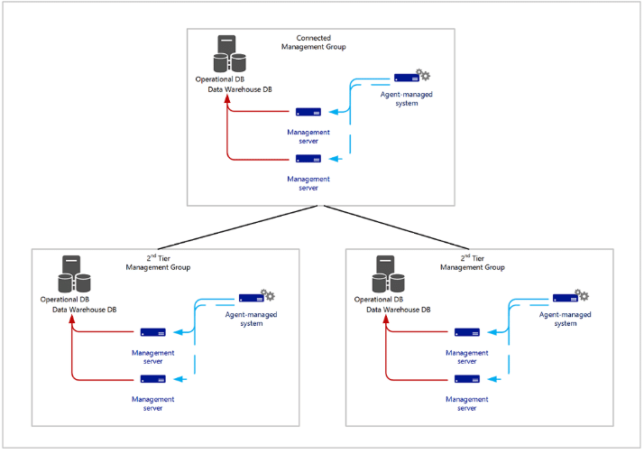 بسیاری از شرکتهایی که در چندین مکان جغرافیایی سرور دارند، به مانیتورینگ مرکزی آن سرورها نیاز دارند. پیکربندی Management Group متصل، که در تصویر زیر نشان داده شده است، مجموعهای از فرآیندهای گردشکار است که برای ایجاد زیرساختهای مدیریت سیستمهای سلسلهای طراحی شدهاند.
