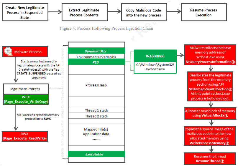 همانطور که در نمودار نشان داده شده است، فرآيند بدافزار نمونه جدیدی از یک پروسه مجاز را در حالت تعلیق یا CREATE_SUSPENDED ایجاد میکند. در این حالت، دستور svchost.exe را در حالت تعلیق آغاز مینمايد. حالت تعلیق امكان دستكاری آدرس حافظه فرآيند قانونی را فراهم میكند. سپس حفاظت از حافظه را ازحالت WCX يا Page_Execute_WriteCopy به حالت RWX يا Page_Execute_ReadWrite تغییر میدهد. دلیل این تغییر اين است كه اگر حفاظت حافظه از نوع WCX باشد، بدافزار نمیتواند بخش جديدی از حافظه را تخصيص دهد. بنابراین، اين حفاظت بايد به حالت RWX يا Page_Execute_ReadWrite تغییر یابد. در ادامه، بدافزار با جمع آوری اطلاعات فراداده ازPEB، آدرس اصلی حافظه فرآیند قانونی را جمعآوری میکند که بعداً آزادسازی میشود تا بخش مذكور از آدرس حافظه را خالی نمايد. در اين مرحله که آدرس حافظه فرآیند قانونی، آزادسازی و Hollow میشود، بدافزار Block جدیدی از حافظه را تخصيص داده و سپس کد مخرب را در آن قسمت از حافظه کپی يا به آن Inject میکند. مرحله آخر ادامه فرآيند است كه طی آن امكان اجرا شدن برای كد مخرب كه در ظاهر فرآيندی قانونی است فراهم میگردد.