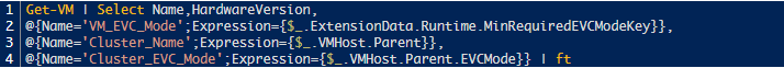 | 1 | Get-VMHost | Select-Object Name,ProcessorType,MaxEVCMode |
