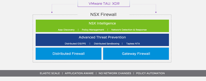 VMware NSX Distributed Firewall یک فایروال لایه 7 مبتنی بر نرم افزار بوده که هدف از ایجاد آن ایمن سازی ترافیک Multi-cloud در بارهای کاری مجازی است. این فایروال با IDS/IPS ،Sandboxing و NTA/NDR که به هر Host بهصورت نرمافزار و توزیعشده ارائه میشود قابلیتهای یک Stateful Firewall را فراهم میکند. NSX Distributed Firewall با قابلیت دید کاملی که به برنامههای کاربردی و جریانها دارد بدین صورت که با خودکارسازی پالیسی متصل به بار کاری امنیت برتری ارائه میدهد. این فایروال برخلاف فایروالهای قدیمی که نیاز به طراحی مجدد شبکه و Hair-pinning ترافیک دارند، فایروالینگ را میان Hostها توزیع و معماری امنیت را اساساً سادهتر میکند. این امر به تیمهای امنیتی امکان میدهد تا بهراحتی شبکه را قسمتبندی، حرکات جانبی حملات را متوقف و Policy را در یک مدل عملیاتی بسیار سادهتر خودکار کنند.
