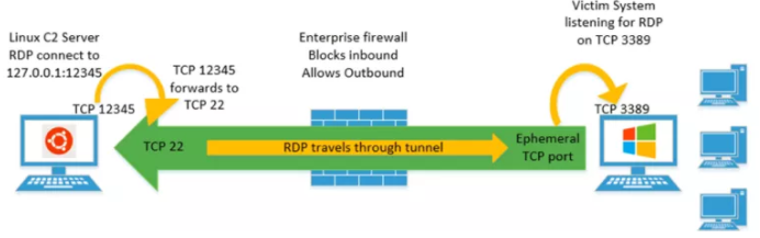 هکرها همچنان استفاده از RDP را بهدلیل داشتن مزایای ثابت و کارکرد آن در قیاس با Backdoorهای غیر گرافیکی که میتوانند ردپاهای ناخواسته بر روی سیستم بهجا بگذارند، ترجیح میدهند. این امر به هکرها اجازه میدهد که به سرور Remoteی که توسط فایروال بلاک شده است اتصال برقرار کرده و از این اتصال بهعنوان یک مکانیزم انتقال جهت Tunnel نمودن سرویسهای محلی شنود از طریق فایروال استفاده کنند که موجب میشود این سرویسها، در دسترس سرور Remote قرار بگیرند.