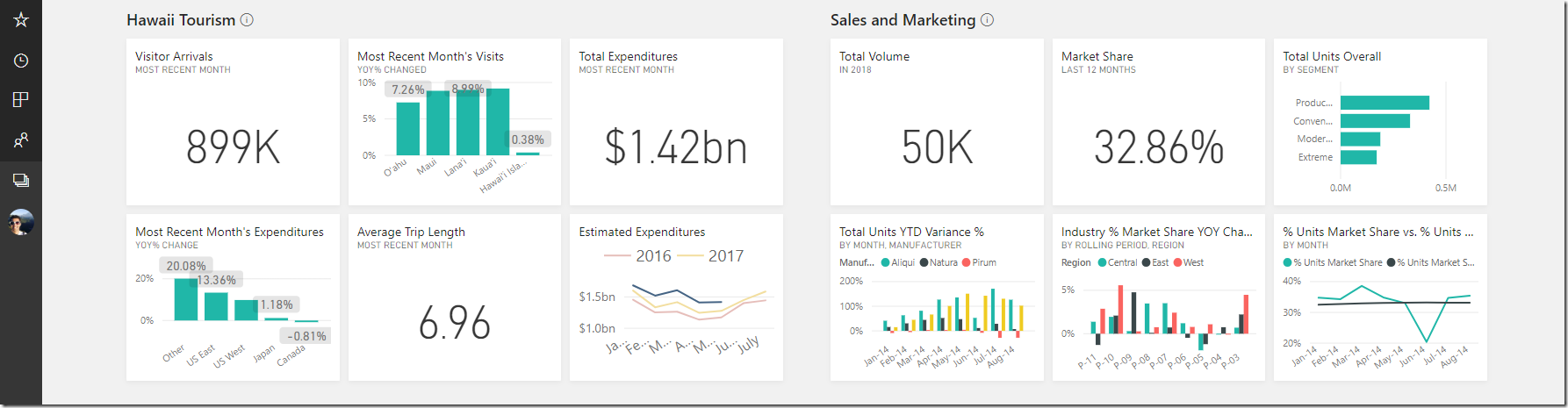 اولین چیزی که توجه کاربر را در آغاز جلب میکند، تصاویر پینشده در بالای صفحهی آغازین است. یک بخش اختصاصی برای افراد افزوده شده است تا معیارها را در یک نگاه، از مهمترین داشبوردهای خود مانیتور کنند. در این نمونهی Home میتوان شش تصویر و همچنین KPIهایی از داشبوردهای فروش و بازاریابی یک شرکت فرضی گردشگری را مشاهده نمود: