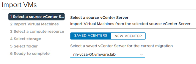 جهت ورود ماشینهای مجازی از یک Remote vCenter Server، vCenter Server منبع نیازمند اتصال است. قابلیت ذخیرهسازی آدرس vCenter Server به انتقالات آینده کمک میکند بطوری که ما میتوانیم تنها Instanceهای از پیش ذخیرهشده vCenter Server را انتخاب نماییم.