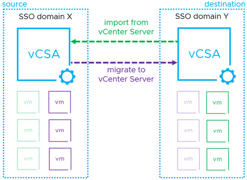 از درون vSphere Client دو workflow موجودند تا بارهای کاری را میان vCenter Serversها انتقال دهند. هرکدام از قابلیت Import VMs در نمای Hosts یا Cluster استفاده میکنند تا ماشینهای مجازی را از vCenter Server Appliance یا VCSA هدف وارد نمایند، یا با انتخاب ماشینهای مجازی و انتخاب Migrate در منو این کار را انجام میدهند.