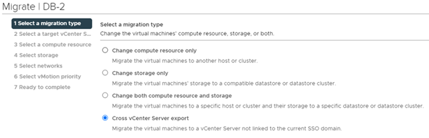 همانند عملیات معمول و دستی vMotion، میتوان قابلیت Migrate را برای یک یا چند ماشین مجازی انتخاب نمود. درکنار قابلیتهای آشنا برای تغییر منابع رایانش یا موقعیت ذخیرهساز برای آن ماشین مجازی، یک قابلیت جدید نیز لیست شده است و آن انتخاب قابلیت جدید Cross vCenter Server Export جهت استفاده از عملکرد XVM می باشد.
