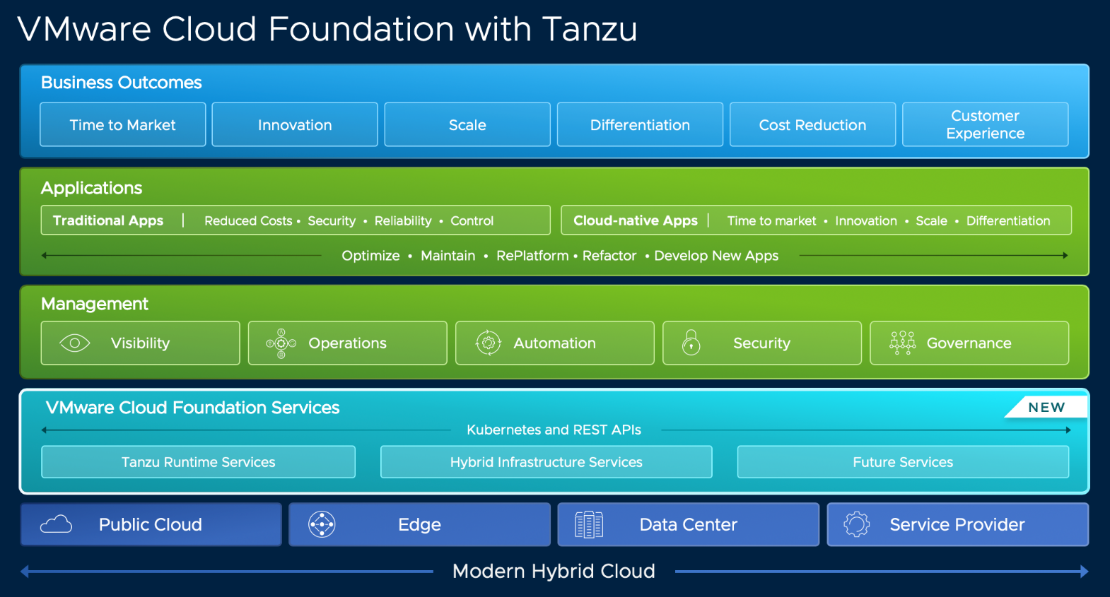 vSphere با Kubernetes از طریق VMware Cloud Foundation 4 با Tanzu قابلدسترسی است. یکی از نوآوریهای کلیدی که تنها در VMware Cloud Foundation قابل دسترسی است، مجموعهای از خدمات برای توسعهدهندگان و Kubernetes API است که IT میتواند آن را آماده سازی کند و به نام VMware Cloud Foundation Services شناخته می شود.