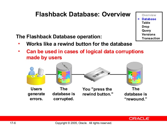 - نیاز به بازیابی پشتیبانگیری و جلو بردن تغییرات به زمان خطا یا خرابی، از بین میبرد. در عوض با استفاده از Flashback Database میتوان یک دیتابیس Oracle را بدون بازیابی فایلهای داده، به نقطهی پیشینی از زمان به عقب برد.