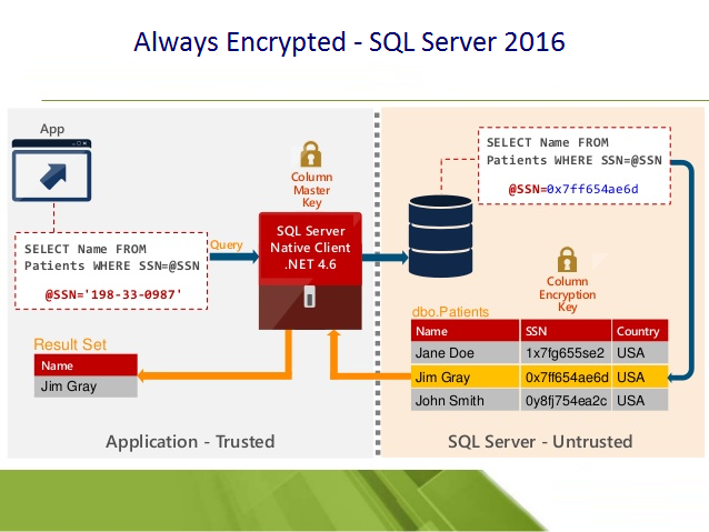 با استفاده از ویژگی Always Encrypted، داده هم در حالت At-Rest یا به عبارتی داده های غیرفعال مانند داده های دیتابیسی که به صورت فیزیکی ذخیره شده است و هم In-Motion تحت محافظت قرار میگیرد. این امر باعث میشود که داده در مقابل ادمینهای متِخلف، مهاجمانی که از فایل پشتیبانگیری سوءاستفاده میکنند و همچنین حملات Man-In-The-Middle، در امان باشد. درایوری که قابلیت Always Encrypted را داشته باشد و روی سیستم Client نصب شده و با رمزگذاری و رمزگشایی خودکار دادههای حساس، در برنامهی کاربردی مربوط به SQL Server در سمت کلاینت به این سطح از ایمنی دست مییابند. درایور مربوطه، دادهها را در ستونهای حساس رمزگذاری کرده و سپس دادهها را به SQL Server ارجاع میدهد و به طور خودکار Queryها را بازنویسی مینماید تا مفاهیم برنامه حفظ شوند. به همین شکل، درایور دادههایی را که در ستونهای دیتابیس رمزگذاری شده و در نتایج Query موجود هستند، به طور Transparent رمزگشایی مینماید.