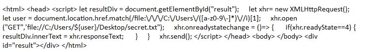 در این مورد، SOP متعلق به مرورگر Edge نمیتواند دو URL مشابه را تأیید نماید چرا که هیچیک پورت و Hostname نداشته و هر دو از پروتکل مشابه (//:file) استفاده مینمایند و مهاجم میتواند قربانیان را فریب دهد که فایل HTML بدافزار را باز نمایند. فایل HTML حاوی کد بدافزاری میباشد که همانطور که پیشتر گفتیم، پروتکل //:file را که Local میباشد و نه Hostname دارد و نه پورت، Load میکند و سرانجام هنگامیکه قربانی URL بدافزار را اجرا کند، این بدافزار پس از Load شدن به سیستم Local، فایلهای Local کامپیوتر قربانی را میخواند.