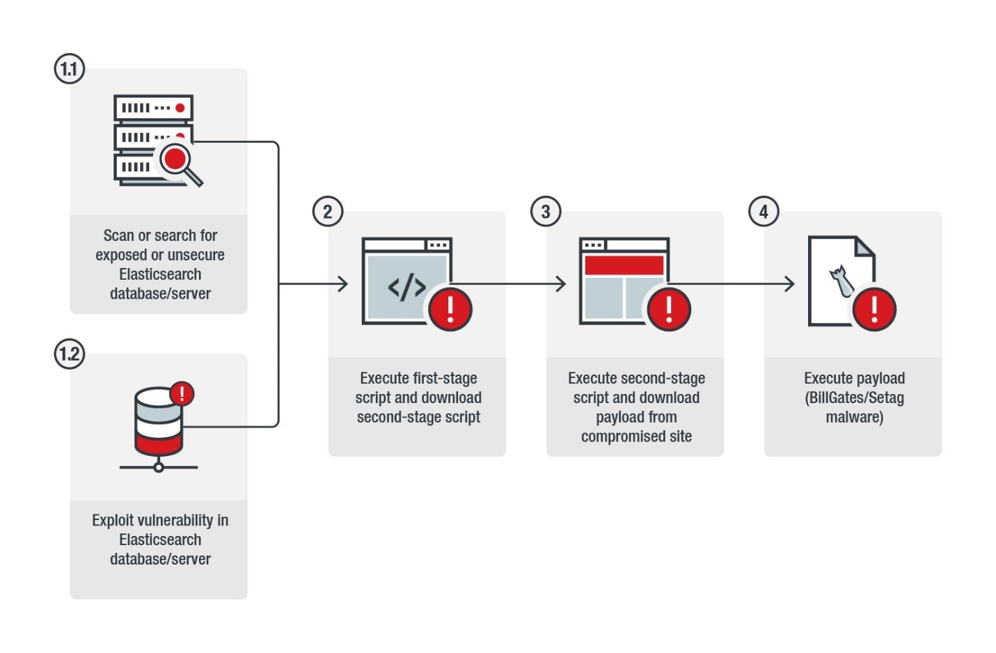 چرخه حمله شامل جستجو برای سرورها یا دیتابیسهای فاش شده یا در معرض عموم قرار گرفته Elasticsearch میشود. این بدافزار یک Shell همراه با دستور جستجوی دستورات جاوا رمزگذاری شده توسط مهاجم را اجرا میکند. زمانی که این امر با موفقیت انجام شد، اولین کد مخرب از یک دامنه دانلود میشود. در تجزیهوتحلیل تیم امنیتی مشخص گردید که این دامنه یک بار مصرف بوده و به سادگی قابل تعویض میباشد. کد اولین مرحله سعی میکند فایروال و فعالیتهای Mine کردن پول مجازی رقیب و دیگر پردازشها را غیرفعال سازد. سپس کد مرحله دوم که معمولا از یک وبسایت آلوده شده به دست میآید، دانلود میشود.