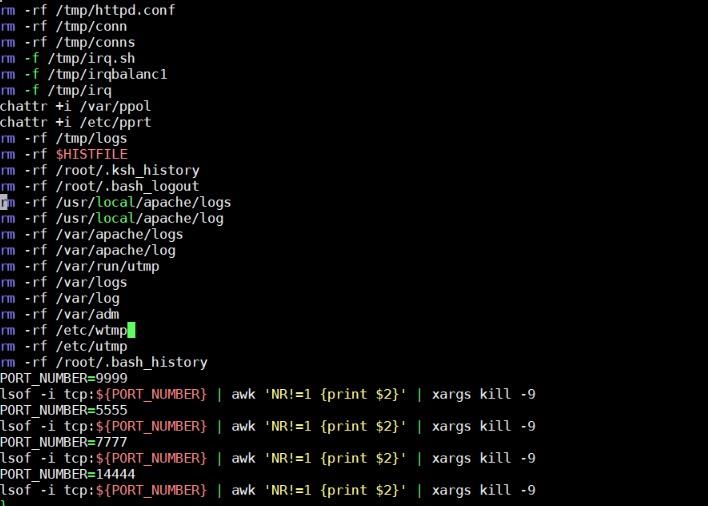 کد مرحله دوم عملکردهایی مشابه کد مرحله اول دارد. این کد نیز مشخص میکند از چه اسکریپت Shellی استفاده شود و فایروال را متوقف میسازد. سپس این کد اقدام به پاک کردن فایلهایی مشخص، ازجمله فایلهای مرتبط با Mine کنندههای پول مجازی رقیب و همچنین فایلهای پیکربندی از شاخه tmp/ میکند. در مرحله بعد این کد برای اجرا کردن عملیات خود پردازشهای ناخواسته و Mine کنندههای حاضر برروی سیستم را از بین میبرد. این کد سپس رد آلوده سازی اولیه و پردازشهایی که برروی پورتهای به خصوص TCP اجرا میشوند را همانطور که در شکل 4 آمده، پاک سازی میکند. مرحله دوم حمله همچنین شامل دانلود کردن فایل باینری میشود ( شکل 5 ) که به احتمال زیاد برروی یک وبسایت آلوده قرار دارد.