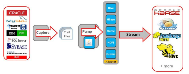 Oracle GoldenGate به Capture نمودن دادهها از سیستمهای منبع ناهمگون از جمله سیستمهای پیامرسان مبتنیبر Java به صورت Non-Invasively و با سربارِ ناچیز میپردازد. این نرمافزار، تراکنشهای پایگاه داده را در Trail Fileها ذخیره نموده و به چارچوبِ Java Adapter میفرستد. Oracle GoldenGate for Big data دارای Adapterهایی برای انواع تکنولوژیهای مربوط به Big Data مانند HDFS، Hive، HBase یا Flume میباشد. ضمن اینکه Oracle GoldenGate for Java را نیز دربرگرفته و این امکان را برای مشتریان فراهم مینماید تا فرآیند تحویل به سایر سیستمهای Big Data را به سهولت انجام داده و از موارد کاربردی خاص و مورد نیاز محیط پشتیبانی نمایند.