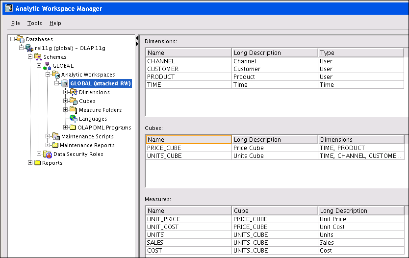 Analytic Workspace Manager، یک ابزار مدیریت گرافیکی میباشد که به طور ویژه برای مدیریت مکعبها و ابعاد OLAP طراحی شده است. استفاده از DBA , Analytic Workspace Manager یا Developerهای برنامه میتواند ابعاد، سلسله مراتب، مکعبها، مقیاسها، قواعد تجمعی، قواعد پیشبینی، اختصاص موارد و سیاستهای امنیتی برای مکعبها و ابعاد را طراحی نماید.