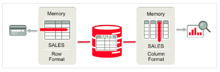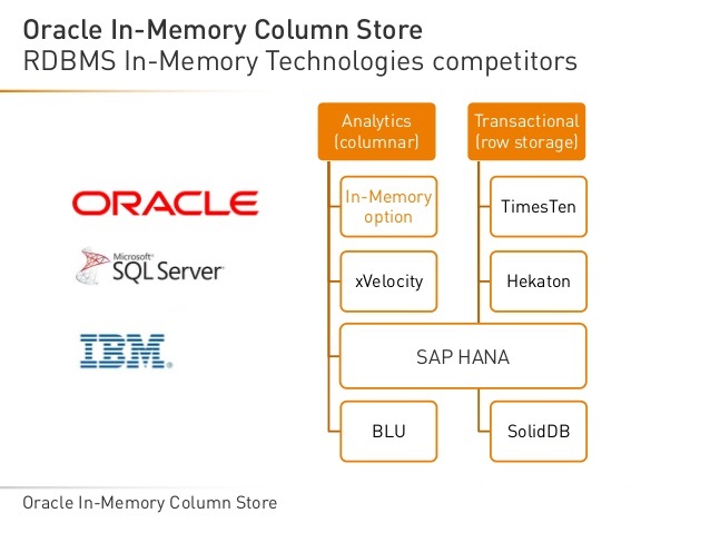 شرکت اوراکل تکنولوژی In-Memory Columnstore را به عنوان یک Add-On انتخابی همراه با Oracle Database 12c برای کاربران ارائه مینماید. در صورت فعال شدن این گزینه برای جداول یا فضاهای جدولی، اوراکل یک کپی از زیرمجموعهی دادهها در فرمت ذخیرهسازی به صورت ستونی (Columnar Storage) به وجود میآورد. بدین ترتیب مدیران پایگاهداده میتوانند صرفا دادههای In-Memory و بسیار مهم به لحاظ عملیاتی را انتخاب نموده و فرآیند آنالیز را تسریع نمایند. روند تغییر در دادههایIn-Memory همواره ادامه نمییابد و باید در هنگام Restart شدن Oracle DB دوباره ایجاد شود. طراحی Oracle In-Memory به شکلی است که برای برنامههای کاربردی و ابزارها به صورت Transparent باشد.