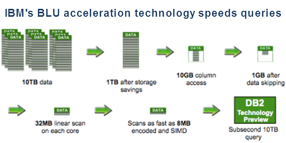 قابلیت IBM DB2 BLU Acceleration به عنوان یک راهکار یکپارچهی محاسباتی In-Memory همراه با IBM DB2 10.5 عرضه گردیده است. این راهکار از چندین فرآیند بهینهسازی برخوردار میباشد اما در مرحله اول توسط مفهومی به نام Table Shadow ایجاد میگردد که یک کپی از دادهها را در فرمت ذخیرهسازی ستونی نگهداری میکند. لازم به ذکر است که هردو جدول به طور خودکار Sync میشوند. تراکنشهای OLTP به طور مستقیم بر روی جداول رابطهای (Relational Tables) اجرا میشوند اما Queryهای تحلیلی موجود بر روی این جداول به سمت Tables Shadow که به صورت ستونی بوده ارسال شده و در نتیجه موجب پردازش تحلیلی سریعتری میگردد.