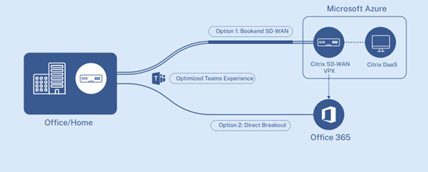 - SD-WAN از Rest APIهای Microsoft که ترافیک مطمئن Office 365 را بطور مستقیم به نزدیکترین نقطه ورودOffice 365 یا در ورودی هدایت، دستهبندی و شناسایی میکنند پشتیبانی مینماید. کاربرانی که از Office 365 در دسکتاپهای مجازی خود استفاده میکنند کیفیتی بهینهشده را تجربه خواهند نمود زیرا Virtual Delivery Agents یا VDAها از SD-WAN VPX در Azure استفاده میکنند تا به نزدیکترین ورودی Office 356 متصل گردند. برای Microsoft Teams پردازش Media بصورت Local در تجهیزات کاربر و با استفاده از Microsoft Teams Optimization Pack صورت میگیرد و به تجهیزات On Premise SD-WAN این امکان را میدهد تا ترافیک Teamها را بطور مستقیم به SD-WAN VPX در Azure هدایت نمایند.