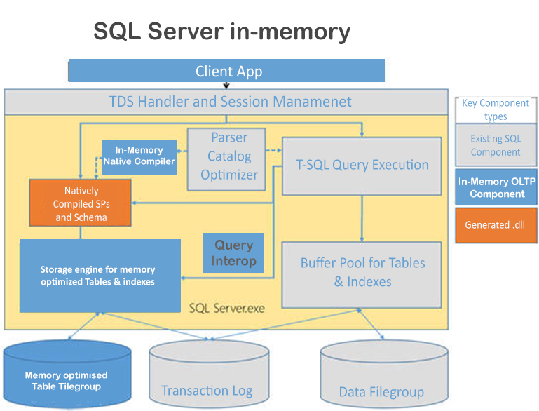 SQL Server میتواند به صورت محلی به کامپایل نمودن Stored Procedureهایی که به جداول Memory-Optimized دسترسی دارند، بپردازد. این روش علاوه بر بهینهسازی TSQL، آنها را به کدهایی در زبان C تبدیل نموده و سپس یک DLL ایجاد میکند. SQL Server میتواند این روند را برای ایجاد کارایی بیشتر در ساختار منطقی کسبوکار، از طریق Stored Procedureهای جدید که در مقایسه با Stored Procedureهای قدیمی از دستورالعملهای کمتری استفاده مینمایند، به اجرا درآورد. نسخه SQL 14 به عبارات پرکاربرد TSQL موجود در بارکاری OLTP اجازه میدهد تا در Stored Procedureها به صورت Native استفاده شوند. تیم SQL Server همچنان به توسعه گستردهی TSQL در نسخههای جدید خود ادامه میدهند.