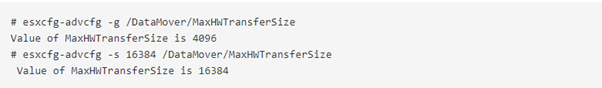 در ابتدا در مورد XCOPY صحبت میگردد، سایز پیشفرض XCOPY چهار مگابایت است. با یک I/O سیودو مگابایتی، انتظار میرود که در یک شمارنده در Esxtop تعداد آیتمهای کاری که برای ارائهی یک I/O سیودو مگابایتی ایجاد میگردد، دیده شود که به مرور بهصورت هشتتایی بالا میرود. در صورت نیاز، میتوان سایز پیشفرض XCOPY را به حداکثر 16 مگابایت رساند، اما این کار فقط باید تحت نظر Storage Array Vendor انجام گردد. دستور زیر نشان میدهد که چطور باید سایز انتقال کنونی را Query کرده و چطور باید آن را تغییر داد: