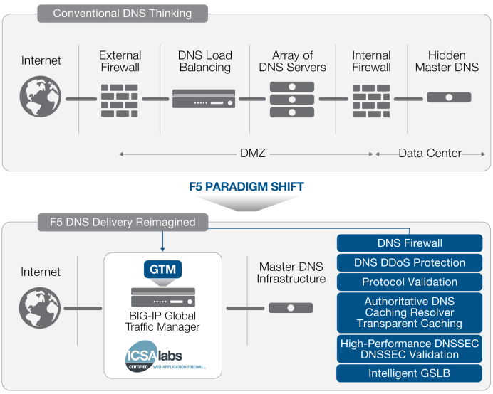 معماریIntelligent DNS Scale متعلق به F5، برای پاسخگویی و انعطافپذیری هوشمندانهتر به مقیاسهای مختلف Queryهای DNS به ارمغان آورده و شرایط و موقعیتهای متفاوتی از شبکه را مد نظر قرار داده است تا درخواستها و سرویسهای برنامه کاربردی را بر اساس Policyهای کسبوکار، شرایط دیتاسنتر، شرایط شبکه و عملکرد برنامه کاربردی توزیع نماید. بدین ترتیب کاربر میتواند به جای نگرانی درمورد قطعیهای DNS و خرید زیرساختهای سرور اضافه جهت راه اندازی DNS با هدف مقابله با ترافیکهای شدید شبکه، به سادگی یک دستگاه F5 BIG-IP را در DMZ متعلق به شبکهی خود نصب کرده و اجازه دهد تا این تجهیز از طرف سرور DNS اصلیاش به Queryها رسیدگی نماید.