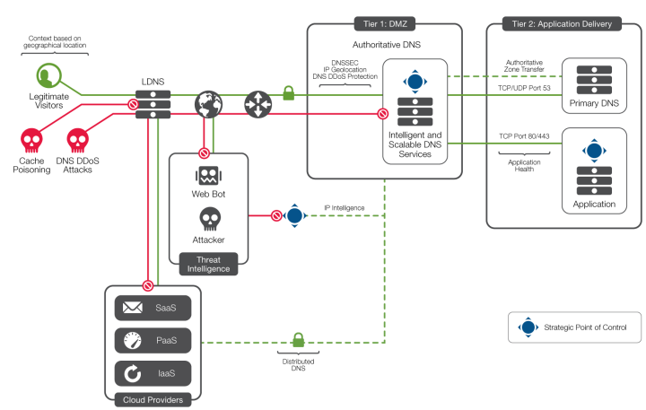 در واقع F5 Intelligent DNS ، یک راهکار ارائهی DNS، بصورت End-to-End است که با کاهش میزان تاخیر DNS، عملکرد وب را بهبود میبخشد، با کاهش خطر حملات DNS DDoS از داراییهای وب کاربر محافظت مینماید، با تجمیع کردن زیرساخت DNS، هزینههای دیتاسنتر را کاهش میدهد و مهمتر از همه، برای دستیابی به بهترین نوع ارائهی سرویس و برنامه کاربردی، مشتریان سازمان، کاربر را به سوی اجزای دارای بهترین عملکرد هدایت مینمایند.