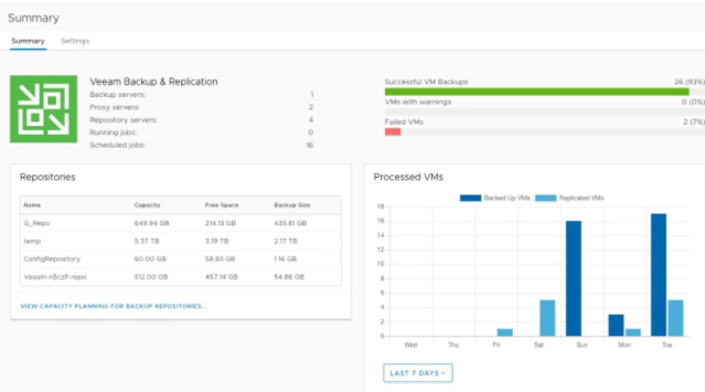 اطلاعات بسیاری در این دو پنل وجود دارد. دیدن تعداد Protected VMها و نسبت Successful Backup Session از بهترین موارد است. لازم به ذکر دوباره است که میتوانیم این اطلاعات را طی مقیاسهای زمانی متفاوت مشاهده کنیم. Jobهایی که هشدار و خطا دارند نیز قابل مشاهده هستند.