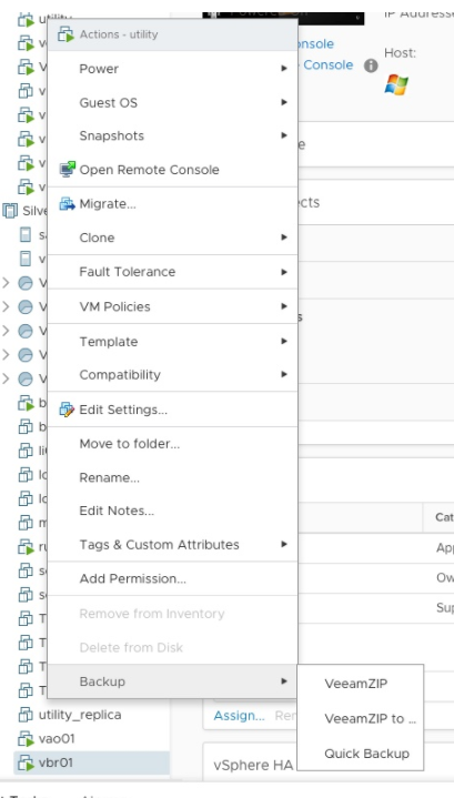 بنابراین به محض اینکه پلاگین Veeam را انتخاب کنید، میتوانید به تعداد زیادی اطلاعات کارآمد و دو گزارش مفید دسترسی پیدا نمایید، اما موارد دیگری نیز وجود دارد. اگر بر روی یک VM راست کلیک کنید، با انتخاب Backup توانایی پشتیبانگیری را نیز خواهیم داشت.