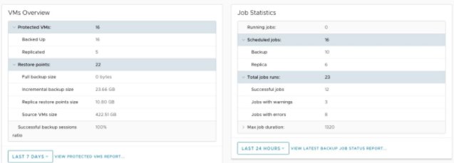 اطلاعات بسیاری در این دو پنل وجود دارد. دیدن تعداد Protected VMها و نسبت Successful Backup Session از بهترین موارد است. لازم به ذکر دوباره است که میتوانیم این اطلاعات را طی مقیاسهای زمانی متفاوت مشاهده کنیم. Jobهایی که هشدار و خطا دارند نیز قابل مشاهده هستند.