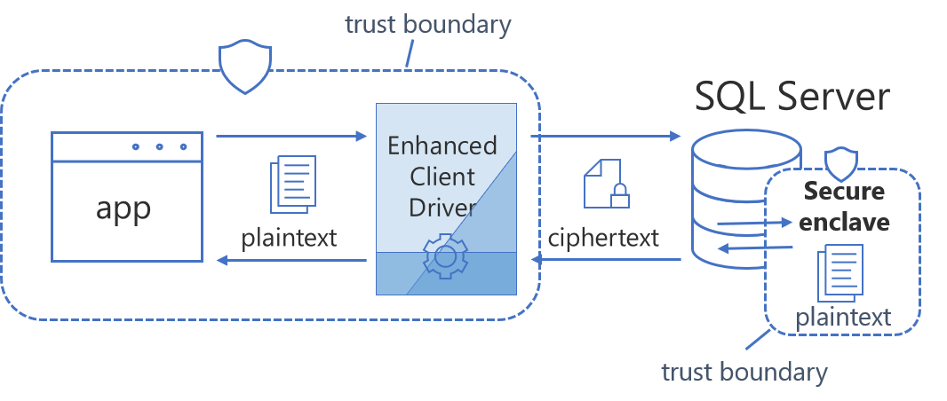 ALWAYSENCRYPTED نسخهی بعدی AlwaysEncrypted است، و فناوری رمزگذاری معرفی شده در SQL Server 2016 است که امکان رمزگذاری واضح ستون را بدون دسترسی ادمینها به کلیدهای رمزگشایی فراهم میکند. یک اشکال در پیادهسازی نخست این است که به دلیل عدم امکان رمزگشایی دادهها توسط SQL Server، Query گرفتن در سمت SQL منجر به انجام محاسبات یا دستکاری مقادیر واقعی ستون نمیشود. با استفاده از تکنولوژی جدید Secure Enclaves، SQL Server اکنون میتواند بخشی از حافظه را به صورت امن رمزگذاری کند تا بتواند محاسبات روی این ستونهای رمزگذاری شده را انجام دهد بدون اینکه مقادیر رمزگذاری نشده در معرض بقیه پردازشها (یا در دسترس ادمینها) قرار گیرند.