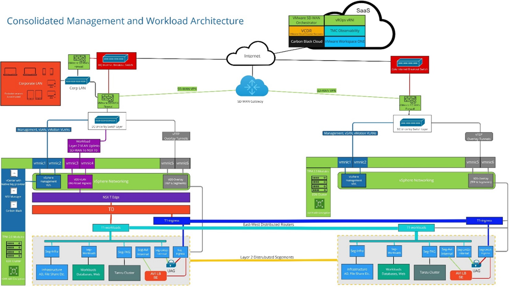 یکی ویژگیهای اصلی این طراحیها که در نمودارها نیز دیده میشود این است که ترافیک شبکه مدیریت با استفاده از بخشهای NSX که مسیرهای جداگانهای به تجهیز فایروال VMware SD-WAN دارند، از ترافیک بار کاری جداسازی میشود. مدیریت ترافیک از یک Subnet VLAN و Gateway روی تجهیز SD-WAN استفاده میکند تا وارد دیتاسنتر شود و ترافیک Ingress بار کاری روی یک Layer 2 VLAN قرار دارد.