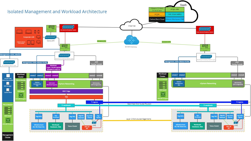 با توجه به تعداد زیاد دیتاسنتر که در نمودار هم نمایش داده شده است، شبکه NSX Overlay را میتوان روی تونل رمزگذاریشدهی SD-WAN توسعه داد تا تمام ترافیک East-West امنیت یکسانی بین سایتها داشته باشند. در سایت دوم، نیازی به ترافیک بار کاری Local Ingress نیست و فقط ترافیک Overlay محفوظ SD-WAN و NSX vTEP میتوانند به بارهای کاری روی کلاستر دیتاسنترRemote دسترسی داشته باشند. با استفاده از تجهیزهای VMware SD-WAN بهعنوان نقطه Ingress اصلی در هر دیتاسنتر، تمام ترافیک بین سایتها در تونل SD-WAN بین آنها بهصورت مجزا باقی میمانند. این امر همچنین تمام ترافیک مدیریت و vMotion را در یک تونل مجزا از شبکه Underlay سازمانی در حین حرکت بین سایتها رمزگذاری میکند و آسیبپذیری زیرساخت مدیریت را نسبت به باجافزار کاهش میدهد.