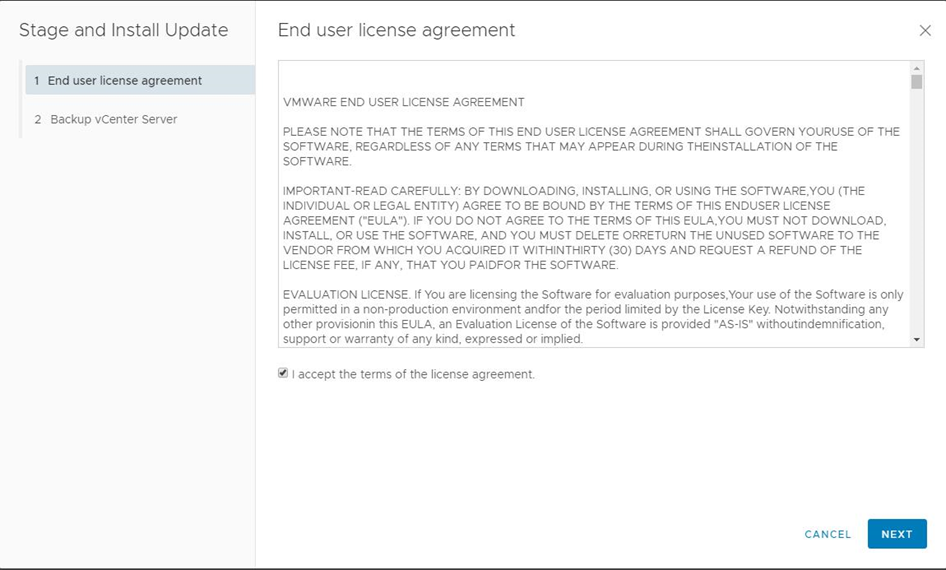 توافقنامه را برای نصب بروزرسانی vCenter Server میپذیریم و بر روی Next کلیک میکنیم.
