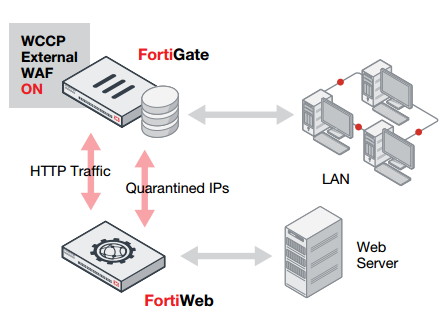 FortiWeb به طور کامل با FortiGate یکپارچه میشود تا از ترافیک HTTP برای انجام بررسی و اشتراک اطلاعات Quarantined IP عبور نماید.