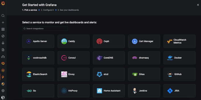 در زمان شروع، Grafana فهرستی از یکپارچهسازیها را فراهم میکند، همانطور که در اسکرینشات زیر نمایش داده شده است. اگر کاربر یک منبع دادهی موجود داشته باشد، میتواند آن را انتخاب کند. اما همچنین میتوان از این مرحله گذشت و در آینده پیکربندیاش را انجام داد. وقتی که کاربران با Grafana آشنا شوند، میتوانند برگردند و داشبورد خود را پیکربندی کنند. نکته مورد توجه این است که استفاده از رابط کاربری Grafana Cloud بسیار ساده می باشد.