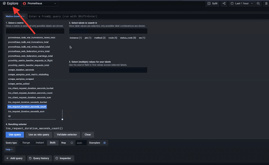 - گزینهی Explore تمام معیارهای سنجش را نشان میدهد. از این منو، میتوان Queryهای خود را پیکربندی کرده و شروع کرد به تصویرسازی معیارهای سنجش خود.