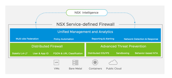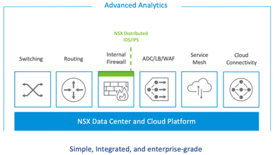 میتوان همراه با مجازیسازی شبکه یا بدون آن، به تمام این موارد دست یافت، بدون مجازیسازی، شبکهی مبتنی بر VLAN موجود تغییر نمیکند و هیچ بار کاری نیازمند فضای آدرس IP جدیدی نخواهد بود. در NSX-T 3.1، فایروال مبتنی بر VMware NSX Service، علاوه بر فراهم کردن کنترل دسترسی L2-L7، اکنون حاوی قابلیت شناسایی و پیشگیری از نفوذ است و برای اولین بار IDPS مبتنی بر شبکه را در Granularity هر بار کاری و در مقیاس Software Defined Data Center یا SDDC فراهم مینماید.