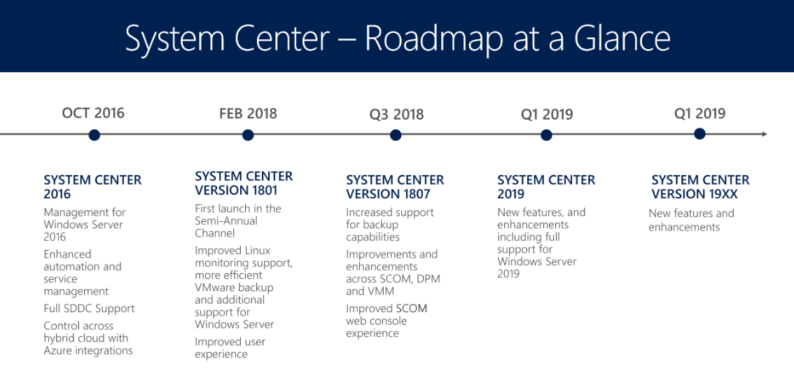 اخیرا مایکروسافت اعلام نمودهSCOM 2019 را در اوایل سال 2019 منتشر خواهد شد، اما این نسخه یک (Long-Term Servicing Channel (LTSC خواهد بود که از 2016 تا کنون اولین بار است که این فرآیند برای SCOM رخ میدهد. طرح System Center مربوطه در پایین ارائه شده است.