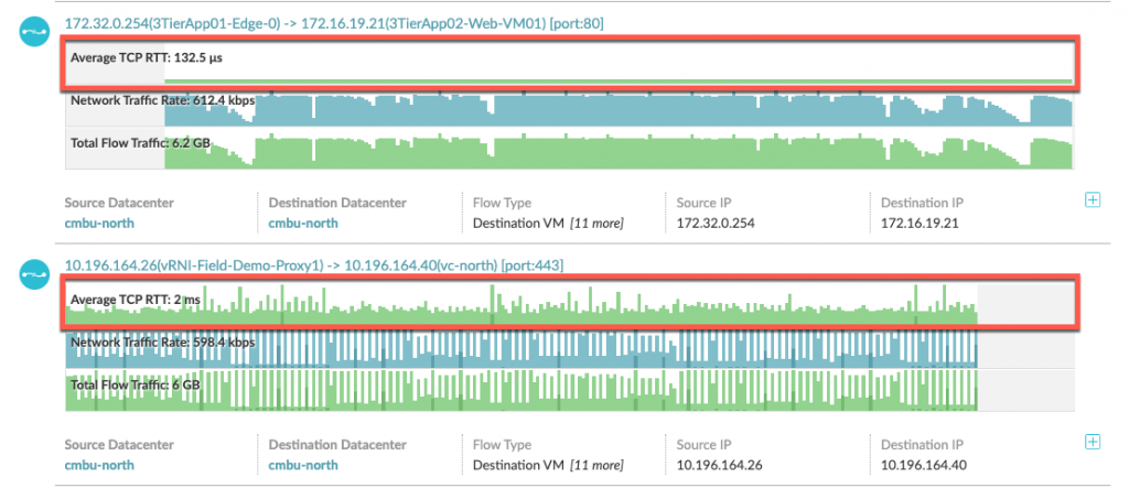 میزان تاخیر یکی از بهترین مواردی است که عملکرد یک برنامهی کاربردی را نشان میدهد؛ میزان تاخیر بیشتر، زمان انتظار بیشتر برای کاربر نهایی (End-User) میباشد. Network Insight 4.2 معیارهای میزان تاخیر شبکه را به دو شکل ارائه مینماید: (TCP Round-Trip Time (RTT که به جریانهای شبکه متصل است و معیارهای میزان تاخیر بین اجزای مشخص (NICهای فیزیکی و مجازی در vSphere Host). معیارهای TCP RTT به جریانهای شبکه متصل شدهاند و میتوان آنها را در داشبورد یک جریان یافت (با کلیک بر یک جریان مشخص) یا این که از موتور جستوجو استفاده نمود.